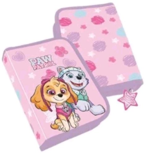 Paw Patrol Girls Filled single decker pencil case, 300D polyester with glitter printed stars, 20 x 12.8 x 3 cm. Contents: 8 triangular sharpened colour pencils, 1 triangular sharpened pencil, pencil sharpener, 15 cm ruler, 1 big eraser 13 x 4.5 x 1 cm. P