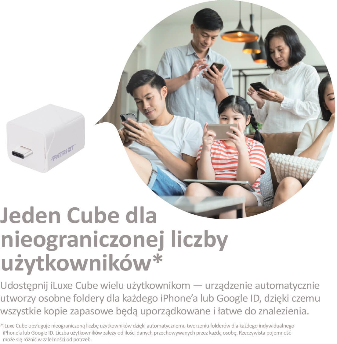 Jedno urządzenie może służyć całej rodzinie. iLuxe Cube automatycznie tworzy osobne, uporządkowane foldery dla każdego iPhone'a lub konta Google ID. Umożliwia to łatwe udostępnianie jednego urządzenia wielu osobom. Wszyscy użytkownicy mają swoje dane bezpiecznie przechowywane i łatwe do znalezienia.