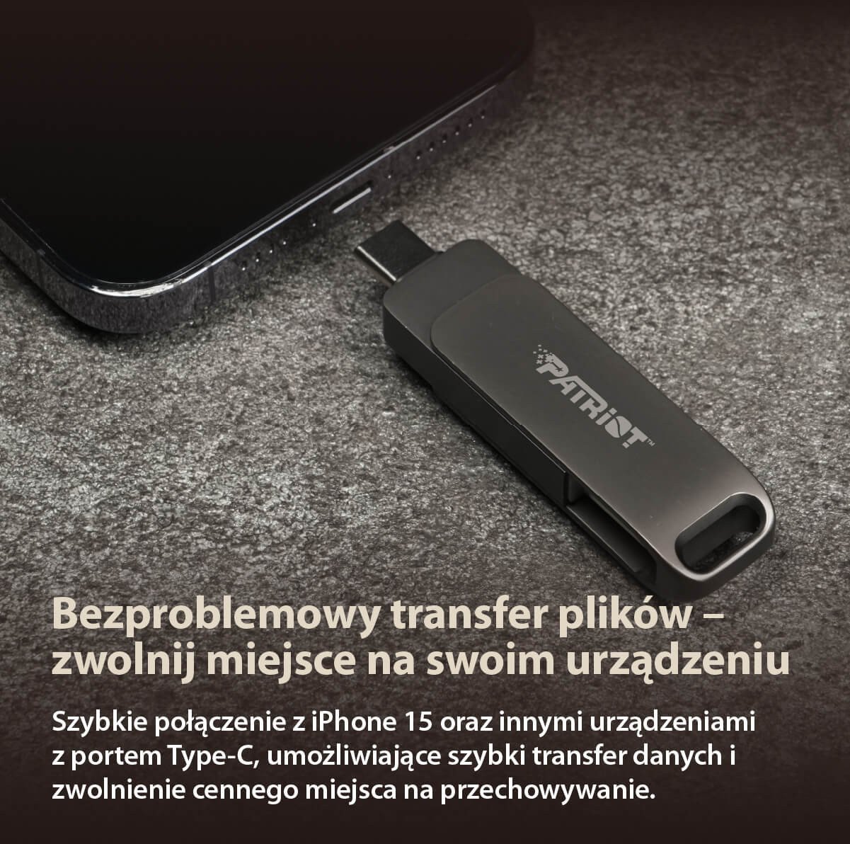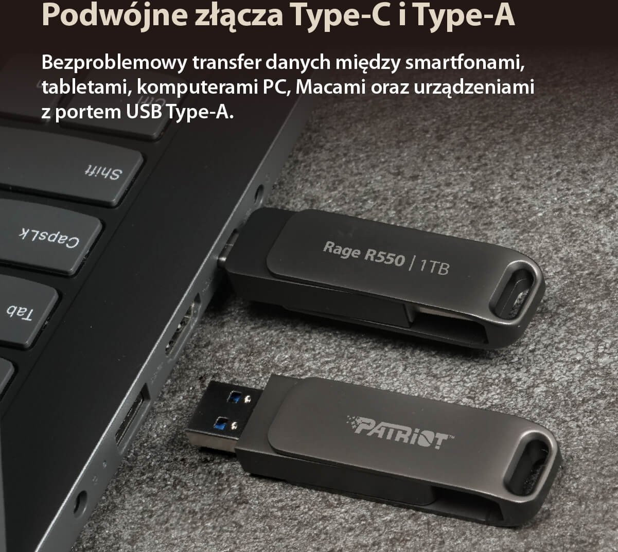 Kluczową cechą pendrive'a Patriot Rage R550 są jego podwójne złącza USB Type-C i USB Type-A. To innowacyjne rozwiązanie umożliwia bezproblemowe przesyłanie plików między szeroką gamą urządzeń, takich jak smartfony (w tym iPhone 15), tablety, komputery PC oraz Maci. Dzięki temu możesz z łatwością przenosić dane między różnymi platformami, bez potrzeby używania dodatkowych adapterów.