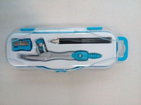 Metalowy cyrkiel z ołowkiem. W komplecie ołówek oraz temperówka. Całość w kolorowym etui z zawieszką. |