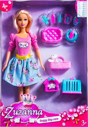 Lalka opiekunka w zestawie z pieskiem, nosidełkiem, legowiskiem, transporterkiem, budą i akcesoriami