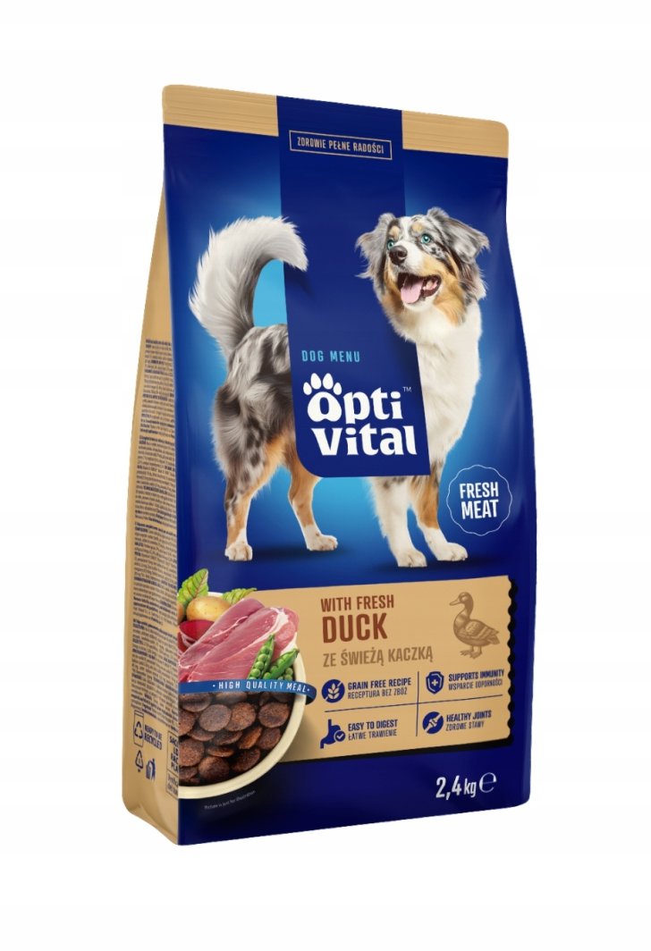 OptiVital pełnoporcjowa karma sucha dla dorosłych psów z kaczką to znakomity wybór dla tych, którzy pragną zapewnić swoim czworonogom zdrową i smaczną dietę. Ta zbilansowana karma o wadze 2,4 kg jest odpowiednia dla psów wszystkich ras, co czyni ją uniwersalnym rozwiązaniem dla każdego pupila.