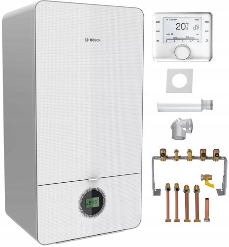 Pakiet kocioł gazowy Condens GC7000iW 20/28C to nowoczesne rozwiązanie grzewcze, które łączy w sobie innowacyjny wiszący kocioł kondensacyjny, regulator CW400 oraz zestaw powietrzno-spalinowy. Dzięki swojej kompaktowej budowie, kocioł doskonale sprawdzi się w wąskich przestrzeniach, co czyni go idealnym wyborem dla każdego domu.