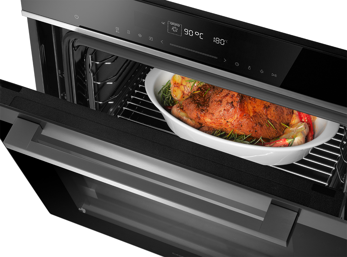 Drzwiczki piekarnika są wyposażone w system cichego domykania drzwi, który zapewnia amortyzowane zamykanie. Lekkim pchnięciem zamkniesz drzwi bez zbędnego hałasu.