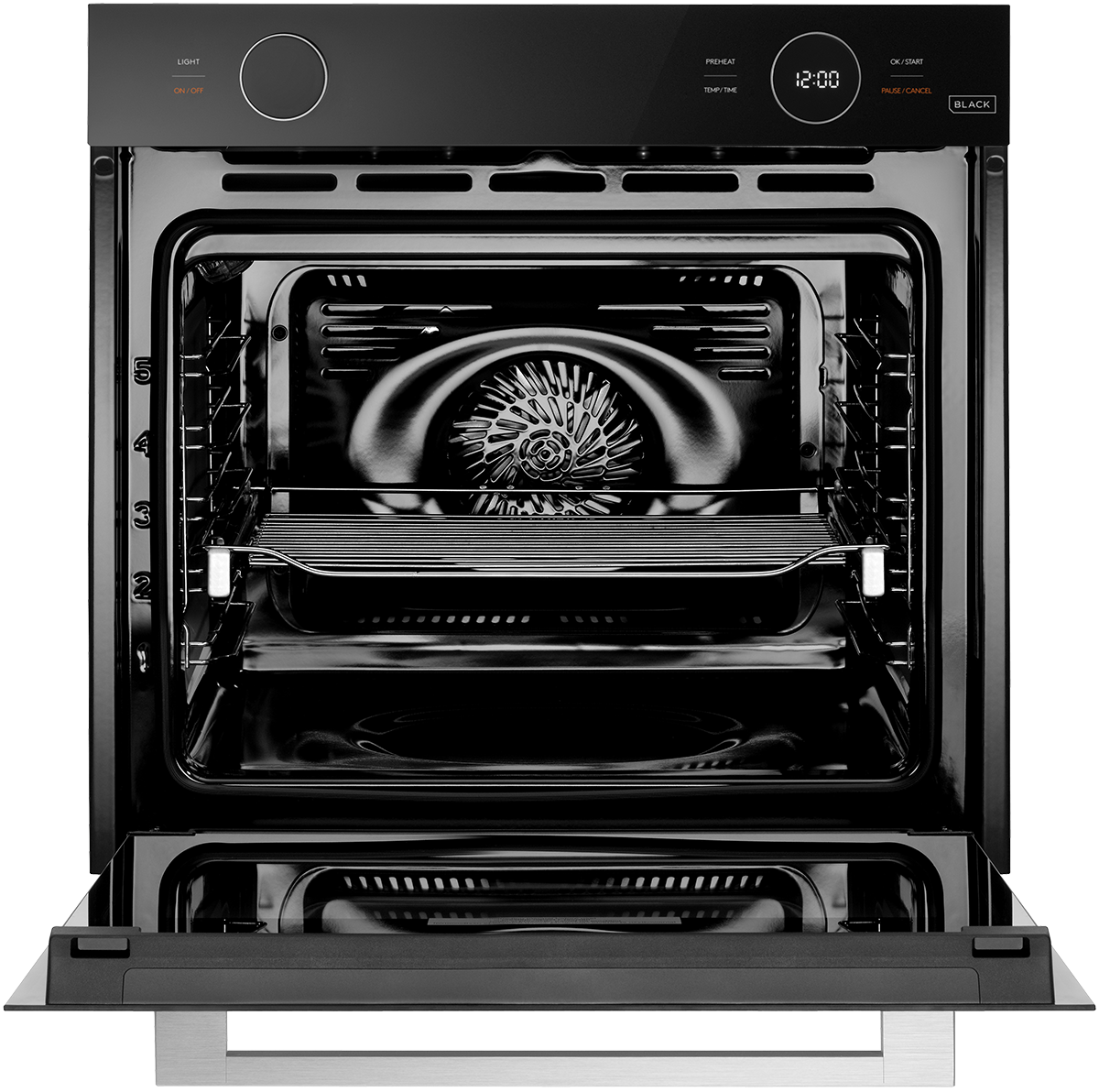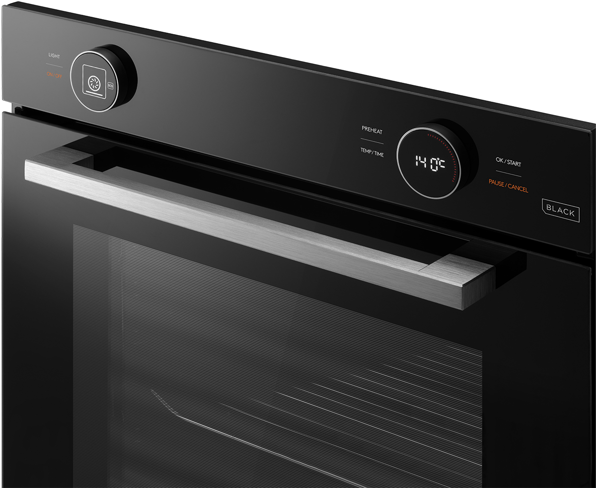 Nowoczesny design podkreśla eleganckie czarne szkło uzupełnione drobnymi elementami ze stali nierdzewnej. Na pierwszy rzut oka zachwyca atrakcyjnym rozwiązaniem panelu sterowania z wyświetlaczem pokazującym funkcję i temperaturę wewnątrz pokrętła. W kuchni doskonale komponuje się z innymi urządzeniami z linii Black.