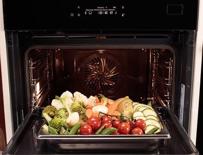 Połączenie pary i gorącego powietrza gwarantuje, że potrawy nie wysychają i można je piec w niższej temperaturze. Gotowa pieczeń będzie soczysta w środku i cudownie chrupiąca z wierzchu.