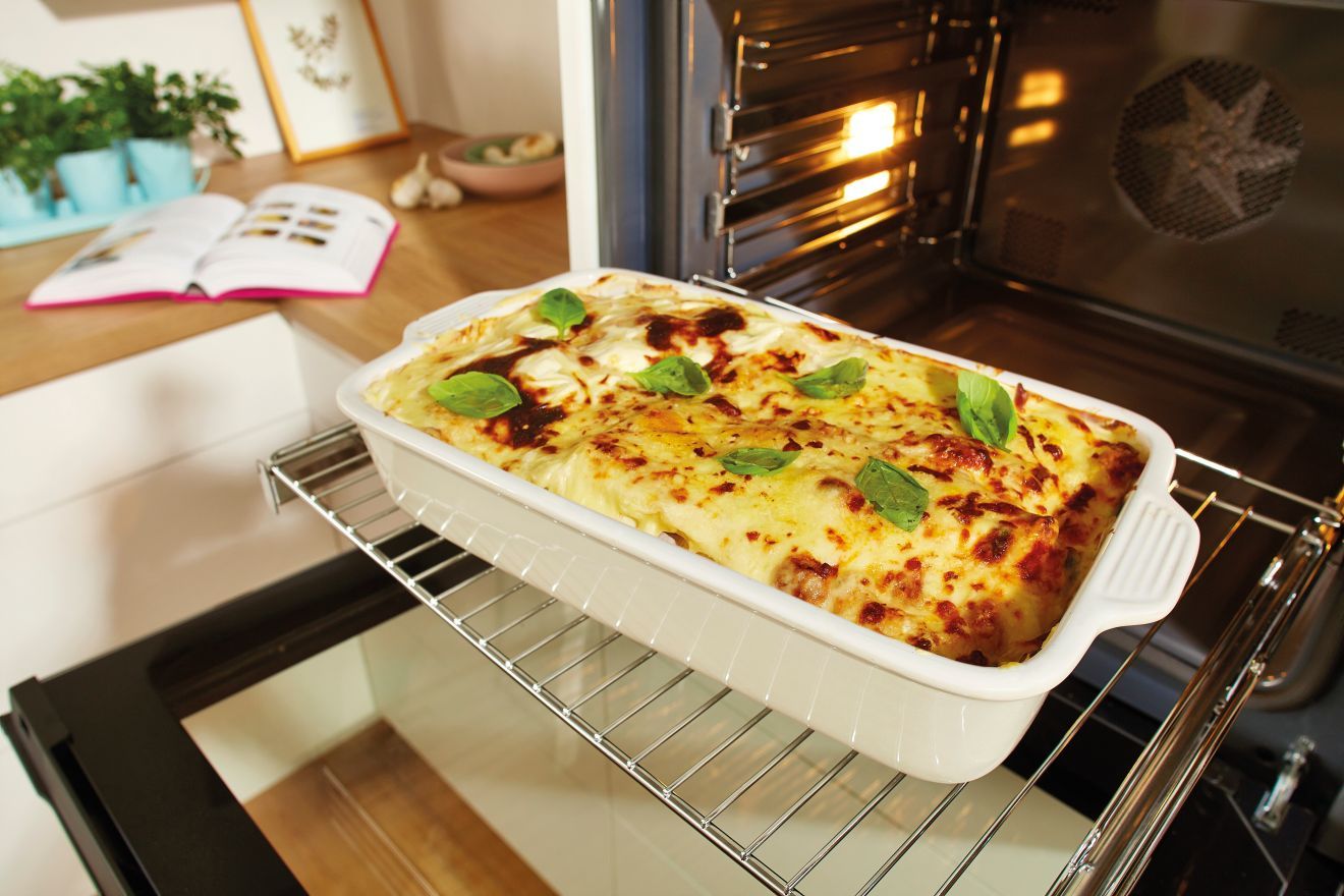 Bardziej przestronne piece pozwalają na gotowanie większej ilości żywności - nie tylko ze względu na równomierną cyrkulację powietrza na wszystkich poziomach, ale także z powodu szerokich na 46 cm tacek do pieczenia zarówno w standardowych, jak i kompaktowych piecach. Innowacyjne rozwiązania pozwalają na większe wnętrze, a szerokość piekarnika jest w pełni wykorzystywana. Na każdej blasze do pieczenia jest więcej miejsca, a doskonała technologia zapewnia równomierne gotowanie potraw na wszystkich poziomach.