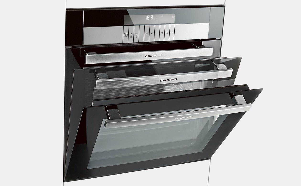 Specjalnie zaprojektowane drzwi piekarników Grundig zamykają się delikatnie, cicho i w bezpieczny sposób.