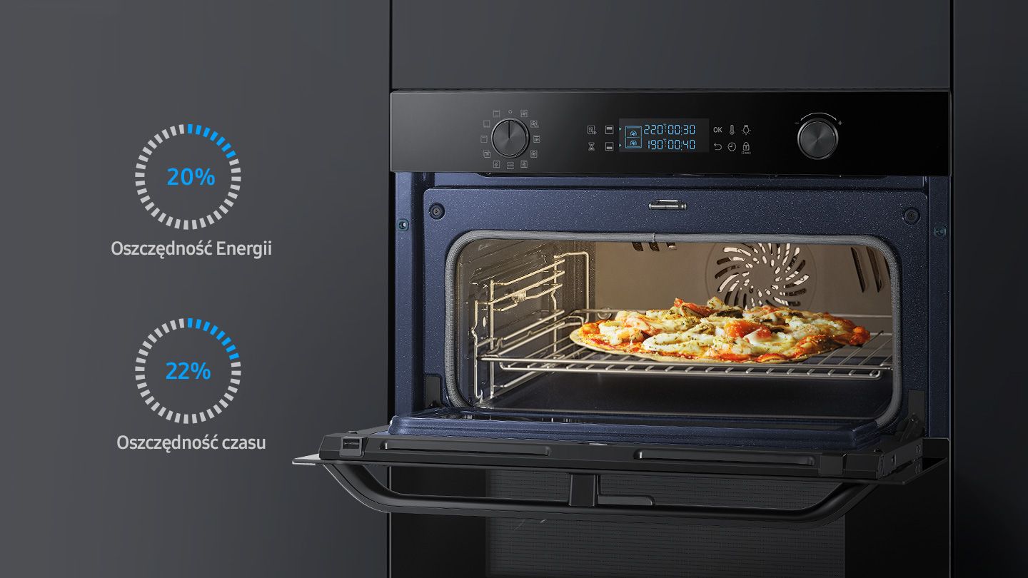 Piekarniki Dual Cook Flex™ zostały wyposażone w dodatkową innowację – rozwiązanie Flex Door. To dzielone drzwi, które zapewniają osobny dostęp do górnej komory bez ingerencji w dolną. Można więc sprawdzać soczystość kaczki bez obaw, że wskutek nagłej zmiany temperatury beza w dolnej komorze opadnie. Piekarnik daje też możliwość mniejszego zużycia energii dzięki pieczeniu tylko w jednej komorze. Przyrządzaj posiłki oszczędzając czas i energię. Korzystanie tylko z górnej komory pieczenia skraca czas przygotowania potrawy o 22% i ogranicza zużycie energii o 20% w porównaniu z użyciem całego piekarnika.