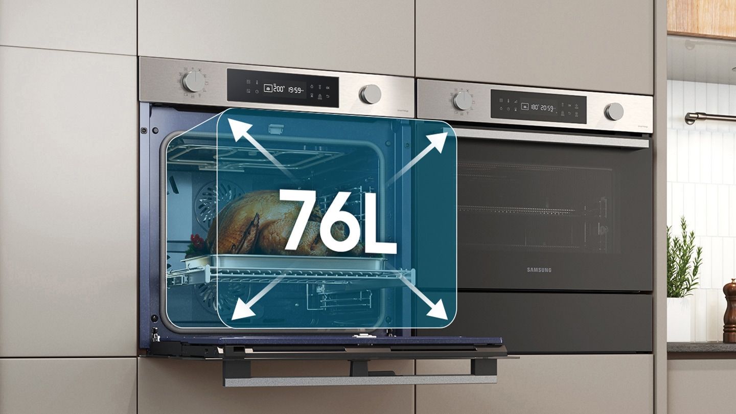Pojemność aż 76L ułatwia przygotowanie potraw o dużych rozmiarach lub ich większej ilości. Stwarza to nowe możliwości podczas gotowania. Przygotowując przyjęcie, można z łatwością przyrządzić różne rodzaje potraw w jednym czasie. Piekarnik spokojnie pomieści nawet tak duże potrawy, jak sporych rozmiarów indyk, zaplanowany na rodzinne spotkanie.