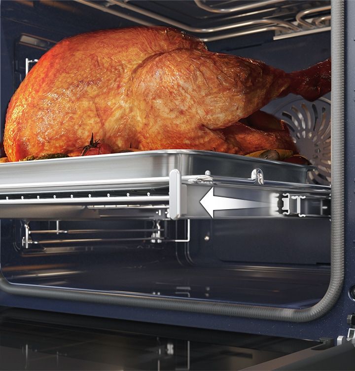 Łatwe wkładanie naczyń i wyjmowanie ich z piekarnika. Prowadnice teleskopowe wysuwają się płynnie i są stabilne nawet wtedy, gdy stawiane są na nich duże i ciężkie naczynia. Dzięki tej funkcji można także podlewać, obracać i doprawiać potrawy bez ryzyka rozlewania.