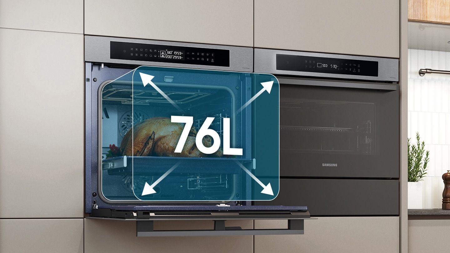 Pojemność aż 76L ułatwia przygotowanie potraw o dużych rozmiarach lub ich większej ilości. Stwarza to nowe możliwości podczas gotowania. Przygotowując przyjęcie, można z łatwością przyrządzić różne rodzaje potraw w jednym czasie. Piekarnik spokojnie pomieści nawet tak duże potrawy, jak sporych rozmiarów indyk, zaplanowany na rodzinne spotkanie.