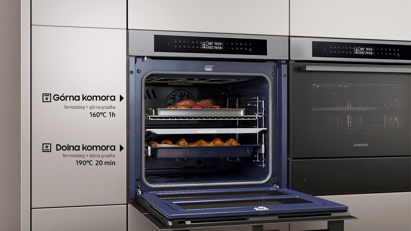 Bardziej elastyczne i efektywne przyrządzanie różnych potraw. Górna i dolna strefa Dual Cook Flex* pracują niezależnie od siebie. Używać można górnej do pieczenia mniejszych dań, korzystać z obu stref jednocześnie, by przygotować różne potrawy wymagające odmiennych ustawień temperatury i czasu lub użyć całej komory piekarnika w celu upieczenia dań wyjątkowo dużych rozmiarów, takich jak indyk. Co więcej, dzielone w połowie drzwi gwarantują łatwy dostęp do górnej strefy, co sprawia, że możliwe jest monitorowanie procesu pieczenia bez żadnych obaw o zaburzenie procesu w dolnej strefie piekarnika.