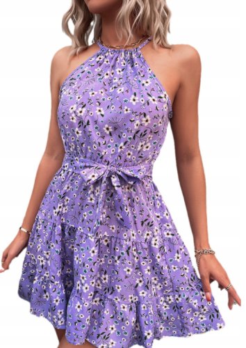 Piękna damska sukienka mini modna w kwiaty fioletowa wiązana XL