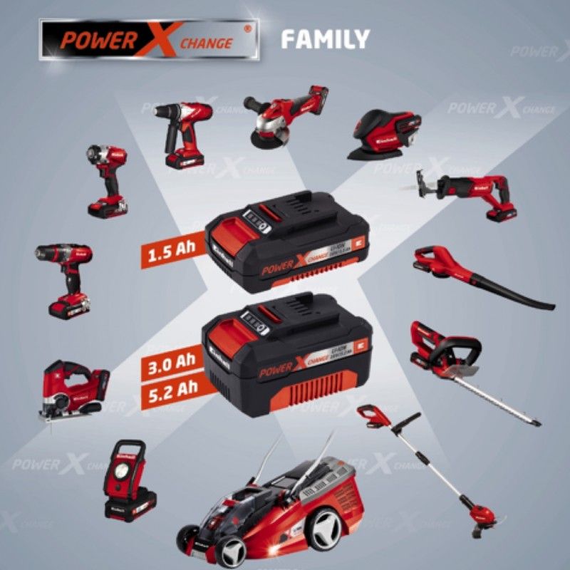 Power X-Change to rozbudowany system akumulatorów firmy Einhell. Dzięki nowoczesnej technologii i ambitnym pomysłom, udało nam się stworzyć system akumulatorów do zasilania elektronarzędzi, który sprawia, że wymiana akumulatorów i narzędzi jest dziecinnie prosta. To ponad 200 urządzeń pracujących na jednym typie akumulatora. Posiadając akumulator można dokupić pozostałe urządzenia w wersji SOLO – bez akumulatora i ładowarki. Dodatkowo istnieje możliwość dokupienia akumulatorów o różnej pojemności (od 2 Ah do 6 Ah) i różnych typów ładowarek.