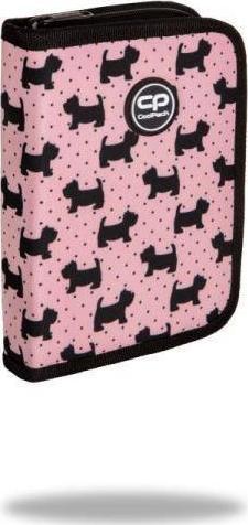 Jednoklapkowy piórnik CoolPack bez wyposażenia od PATIO. Posiada jedną komorę, która jest zamykana suwakiem z logiem CoolPack. Na wewnętrznych, usztywnionych ściankach znajdują się gumki do mocowania przyborów. Piórnik posiada również dwie przezroczyste kieszenie. Na zewnętrznej części piórnika wyszyty jest czarno-różowy wzór z pieskami w typie sznaucera. Wymiary opakowania i piórnika: 21x14x3,5cm