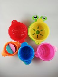 Piramida kubeczków to znakomita zabawka do zabawy w wodzie oraz w piasku. Dzięki małym dziurkom o różnych kształtach na dnie kubeczków, dzieci mogą przelewać wodę lub przesypywać piasek, co czyni zabawę jeszcze bardziej interaktywną. Dodatkowo, najmniejszy kubeczek wyposażony jest w młynka, który obraca się podczas nalewania wody, co dostarcza dodatkowych wrażeń.