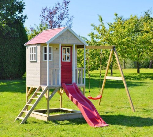 Klaara M10 została wykonana z wysokiej jakości drewna sosnowego, które posiada certyfikat FSC®. Dzięki temu możesz być pewien, że produkt jest nie tylko wytrzymały, ale również bezpieczny dla Twojego dziecka. Urokliwy wygląd domku z zadaszoną werandą oraz niebieskimi drzwiami przyciąga wzrok i zachęca do zabawy.
