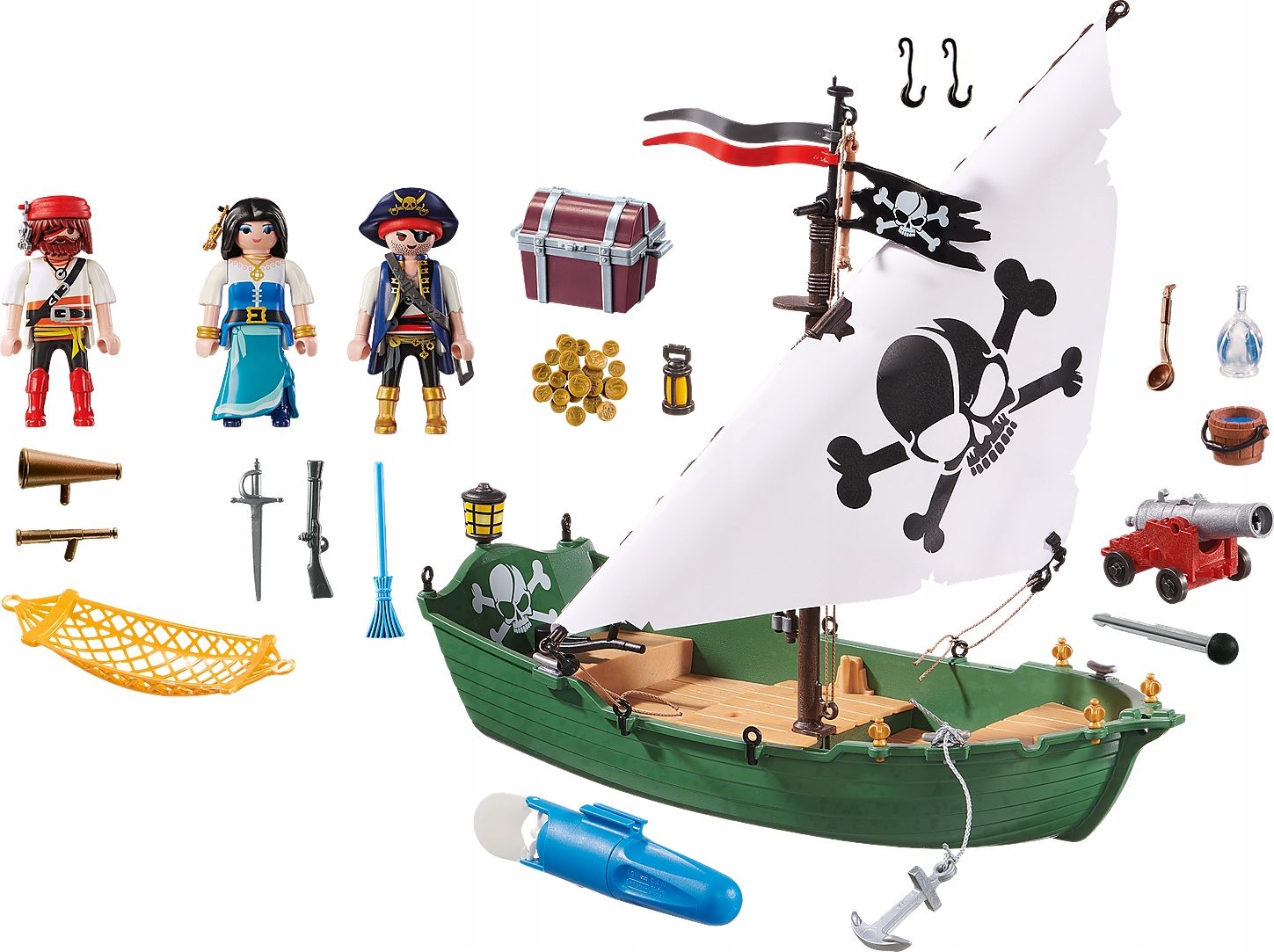 W zestawie: statek piracki, 2 figurki piratów, 1 figurka kobiety pirat, armata, skrzynia, hamak, pieniądze, broń, miecz, inne elementy widoczne na zdjęciu. | ![]() |