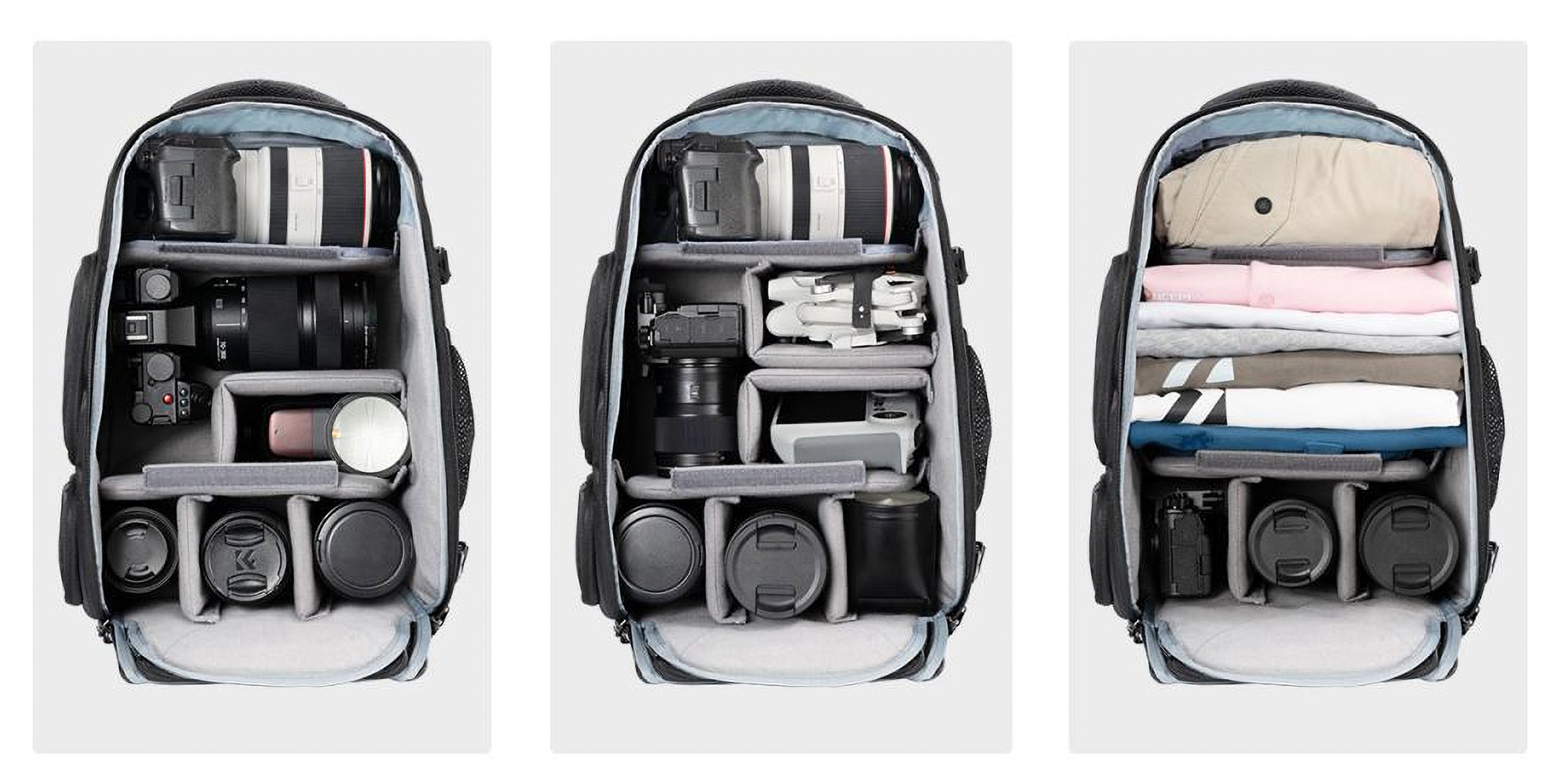 Plecak fotograficzny K&F Concept Camera Backpack o pojemności 25 litrów to prawdziwe centrum dowodzenia dla fotografa, vlogera lub filmowca. Dzięki 3-poziomowej organizacji wnętrza masz pełną kontrolę nad tym, jak przechowujesz swoje urządzenia. Górna komora idealnie nadaje się do transportu dużego obiektywu lub drona. Środkowa komora z powodzeniem pomieści dwa aparaty lub dodatkowe obiektywy. Dolna komora zapewni miejsce na trzy obiektywy lub jeden aparat z dodatkowym szkłem. To Ty decydujesz, jak zagospodarujesz dostępną przestrzeń. Regulowane przegródki pozwolą Ci dostosować wnętrze plecaka do najróżniejszych potrzeb.