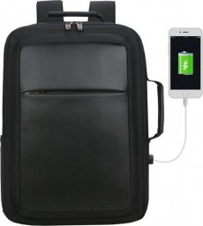Wielofunkcyjny plecak/teczka z wbudowaną ochroną RFID na laptop 17" i tablet 10". Wykonany z wodoodpornego i wytrzymałego nylonu. Posiada wiele kieszeni, przegródek i wygodne szerokie szelki. Istnieje możliwość poszerzenia plecaka przez rozpięcie dodatkowego zamka. Ciekawym rozwiązaniem jest wmontowany port USB, dzięki któremu można podładować swój smartfon (kabel dołączony w zestawie). Pomysłowa konstrukcja plecaka pozwala na przekształcenie go w teczkę. Z boku i u góry plecaka umieszczono dwa miękkie uchwyty, dzięki którym można go przenosić w ręku - jak torbę (szelki są chowane). Doskonale sprawdzi się także w podróży jako bagaż podręczny. Posiada specjalny pasek umożliwiający zamocowanie go na uchwycie walizki.