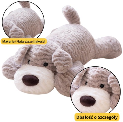 Jego sympatyczna buzia z dużym noskiem, długie, zwisające uszka oraz puchaty ogonek nadają mu wyjątkowo przyjazny i pocieszny wygląd. Zwierzak leży w wygodnej, naturalnej pozycji z łapkami wyciągniętymi do przodu i do tyłu, co sprawia, że wygląda jak prawdziwy szczeniaczek. Taka forma pobudza dziecięcą wyobraźnię, zachęcając do tworzenia scenek i opowieści z udziałem pieska, co wspiera rozwój emocjonalny i kreatywność najmłodszych.