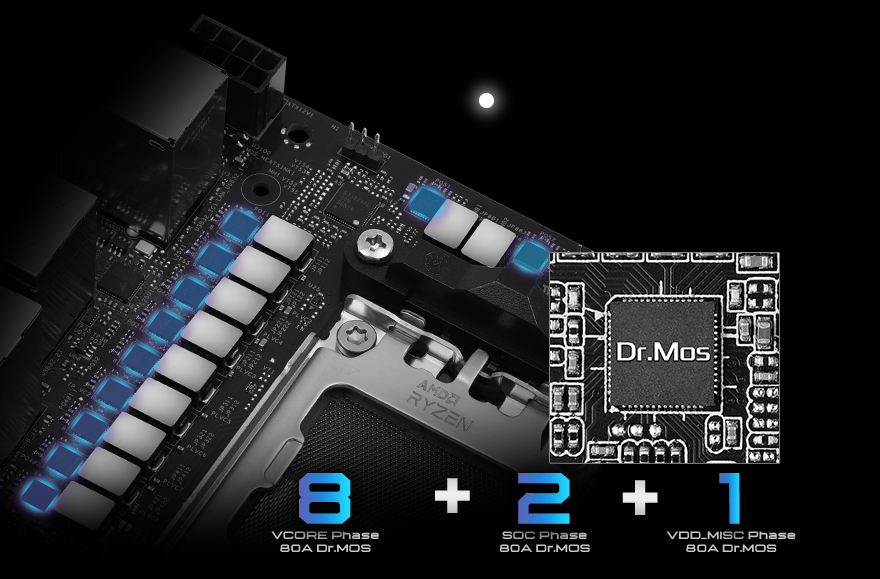 Płyta została wyposażona w solidną, 8+2+1-fazową sekcję zasilania z Dr.MOS 80A dla VCore+SOC+MISC. Tak zaawansowana konstrukcja VRM zapewnia stabilne i płynne dostarczanie energii do procesora, co jest kluczowe dla uzyskania najwyższej wydajności, zwłaszcza w kompaktowej obudowie. Zintegrowane stopnie mocy Dr.MOS inteligentnie dostarczają wyższy prąd dla każdej fazy, co przekłada się na lepsze rezultaty termiczne i lepszą wydajność w porównaniu do tradycyjnych dyskretnych tranzystorów MOSFET.