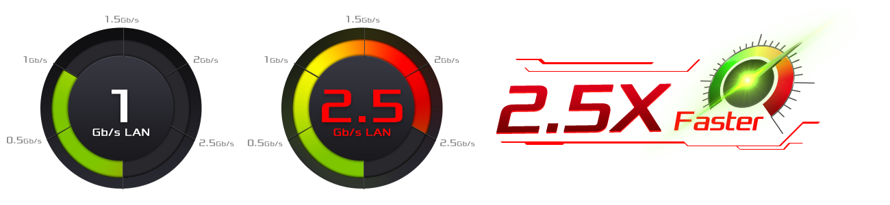 Wykraczając poza gry! Płyta główna ASRock 2.5Gb / s z wyższą przepustowością, która jest doskonała przy małym przesyłaniu plików w pakietach i wyzwala oszałamiającą wydajność szczególnie w grach.