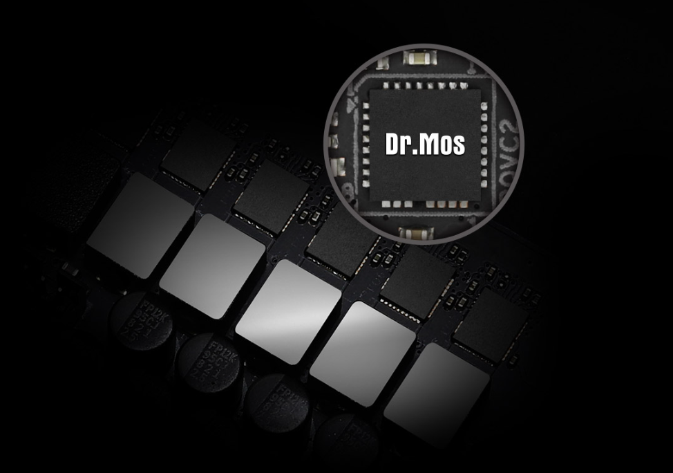W porównaniu do tradycyjnych dławików, dławiki mocy ASRock 60A klasy premium efektywnie, nawet trzy krotnie lepiej saturują napięcie, dostarczając stabilne i wzmocnione zasilanie Vcore do płyty głównej. Dr.MOS to zintegrowane rozwiązanie zasilające, zoptymalizowane dla synchronizacji napięcia w wielu aplikacjach! W porównaniu do tradycyjnych MOSFET’ów, inteligentnie dostarcza napięcie do każdej fazy, zapewniając niższe temperatury pracy i wyższe osiągi.