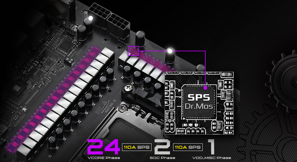 Niezawodne komponenty gwarantują bezproblemowy przesył mocy do procesora. Co więcej, oferują niedoścignione możliwości overclockingu oraz najwyższe osiągi przy najniższych temperaturach dla profesjonalnych graczy. Dr. MOS zawiera najnowszą technologię SPS (Smart Power Stage). Monitoruje on napięcie i temperaturę każdej fazy zapewniając dostarczenie właściwej ilości mocy do procesora, co zwiększa jego osiągi oraz możliwości overclockingu.