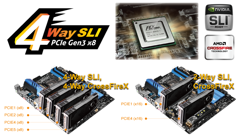 Ten model płyty głównej świetnie sprawdzi się w najbardziej rozbudowanych konfiguracjach PC. Zastosowano tu aż 4 gniazda rozszerzeń PCI Express x16. Jeśli więc w planach znajduje się konfiguracja z dwoma wydajnymi kartami graficznymi, to zdecydowanie warto wziąć pod uwagę taką liczbę gniazd rozszerzeń. Cztery gniazda PCI Express x16 stosowane bywają głównie na płytach głównych z wyższej półki, które dedykowane są do budowy komputerów gamingowych i wydajnych stacji roboczych.