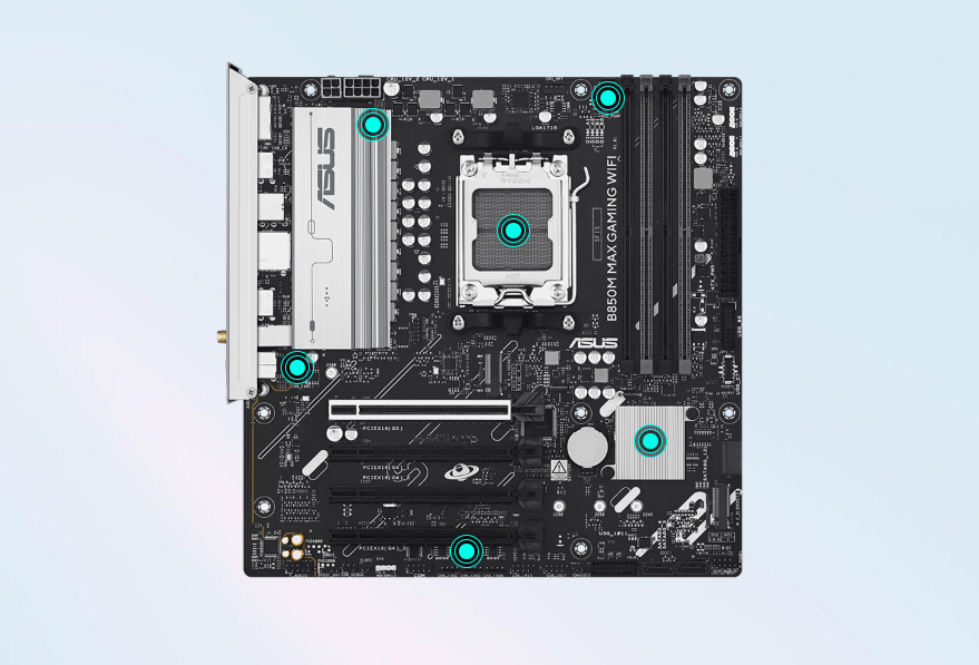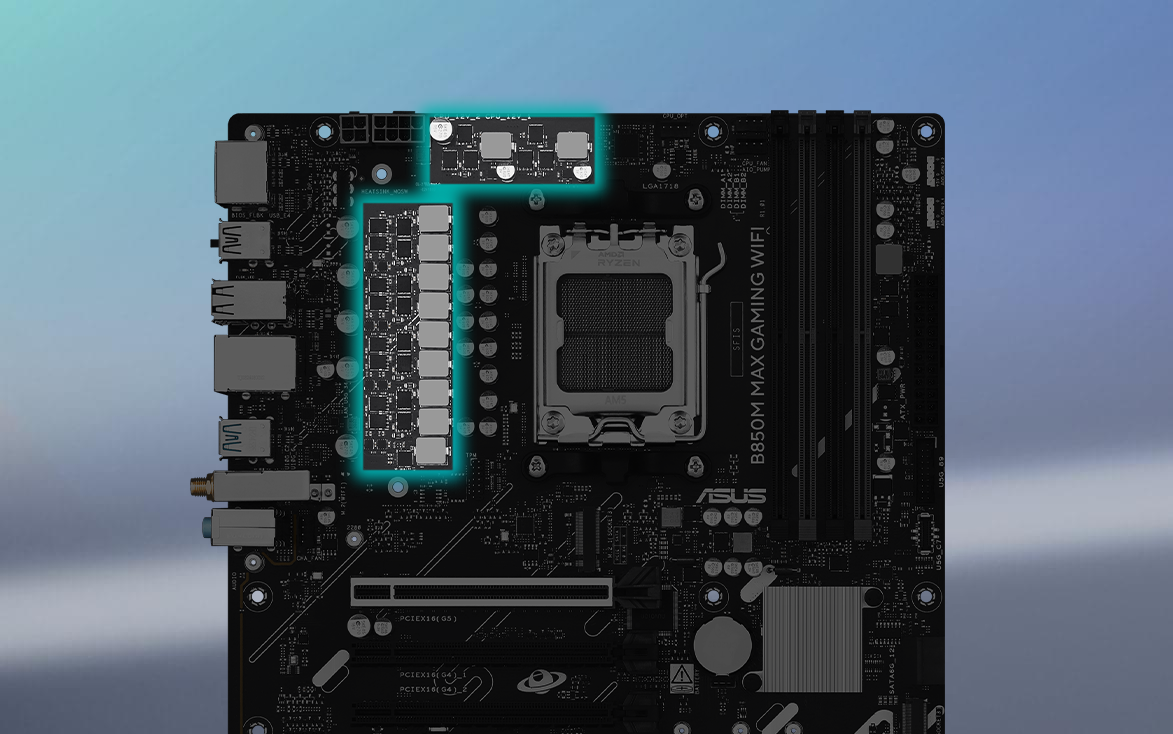 ASUS B850M MAX GAMING WIFI wyposażono w cyfrową sekcję zasilania o konfiguracji 8+2+1 fazy. Taka konstrukcja gwarantuje stabilne i efektywne dostarczanie mocy do procesora, nawet podczas intensywnego obciążenia i podkręcania. Zastosowanie wysokiej jakości komponentów, w tym dławików i kondensatorów TUF, zapewnia nie tylko niezawodność, ale także dłuższą żywotność całej płyty. Dzięki temu masz pewność, że twój procesor będzie pracował z pełną mocą bez ryzyka niestabilności.