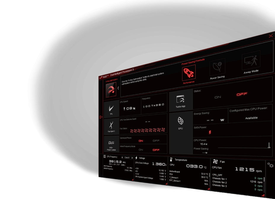 Opcje konfiguracyjne obejmują również takie sfery działania komputera jak układ chłodzenia, praca karty dźwiękowej i sieciowe oraz pobór energii. Wszystko to możecie dostosować za pomocą oprogramowania ASUS 5-Way Optimization, zmieniającego najważniejsze parametry w czasie rzeczywistym. | ![]() |