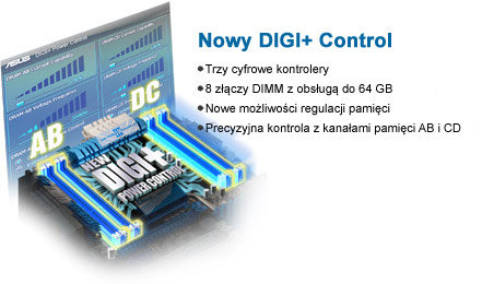 Płyt główne ASUS X79 wyposażono w nowy układ DIGI+ Power Control z trzema kontrolerami napięcia, w tym zupełnie nowe kontrolery napięcia DRAM, które umożliwiają niezwykle precyzyjną regulację napięcia nie tylko w procesorze, ale również w pamięci. Ta innowacyjna technologia stworzona przez firmę ASUS zapewnia najbardziej precyzyjną regulację napięcia, co przekłada się na lepszą wydajność, zwiększoną stabilność i wyższe osiągi.