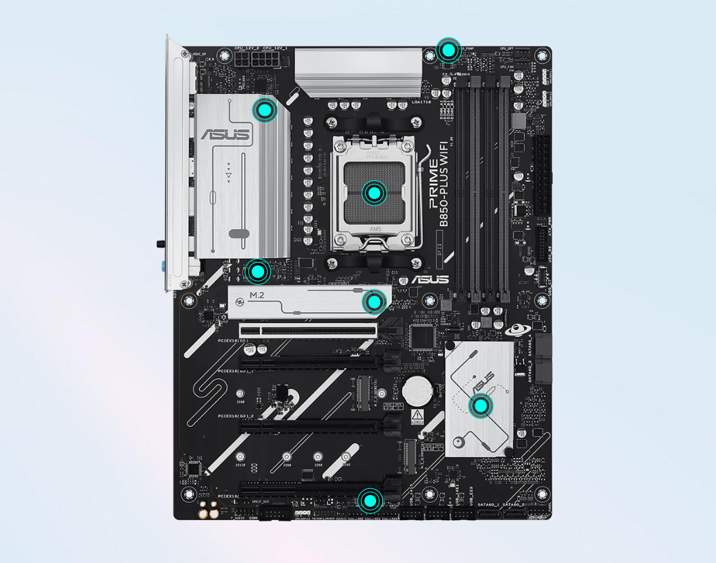 Płyta główna PRIME B850-PLUS WIFI została wyposażona w wiele zintegrowanych radiatorów i szereg hybrydowych złączy wentylatorów, aby zapewnić chłodzenie i stabilność Twojej konfiguracji pod dużym obciążeniem.