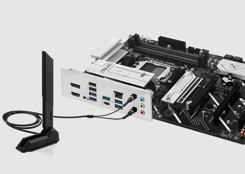 PRIME B850-PLUS WIFI oferuje łącznie trzy gniazda M.2, w tym jedno obsługujące transfer danych z prędkością do 128 Gbps poprzez PCIe 5.0 oraz dwa obsługujące PCIe 4.0. Umożliwia to szybsze uruchamianie systemu i ładowanie aplikacji z dysków systemowych lub aplikacyjnych.