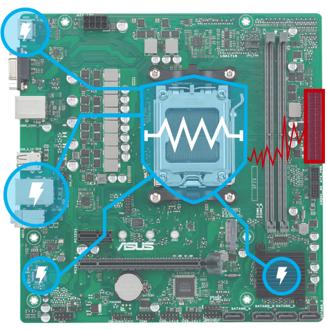 Osłony ASUS ESD Guards zapobiegają uszkodzeniom spowodowanym wyładowaniami elektrostatycznymi, do +/- 10 kV w przypadku wyładowań w powietrzu i +/- 15 kV w przypadku wyładowań kontaktowych, rozmieszczone w konstrukcji aktywnego obwodu ochronnego, który przedłuża żywotność komponentów.