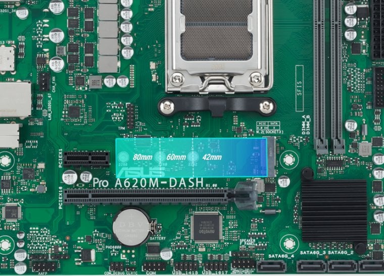 Ta biznesowa płyta główna jest wyposażona w jedno gniazdo M.2, które obsługuje prędkość przesyłania danych do 64 Gb/s poprzez PCIe 4.0, umożliwiając szybsze uruchamianie i ładowanie aplikacji na dyskach z systemem operacyjnym lub aplikacjami.