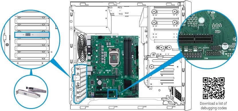 Złącze debugowania ASUS to 10-1-pinowe złącze o niskiej liczbie pinów (LPC) do podłączania kart debugowania w celu szybszego i wydajniejszego rozwiązywania problemów z płytą główną. Po podłączeniu do karty ASUS Debug Card administratorzy mogą przeglądać kody błędów i debugowania na zintegrowanym wyświetlaczu LCD oraz uzyskać lepszy pogląd na procesy inicjalizacji i odzyskiwania. Biznesowe płyty główne ASUS zapewniają kompletne rozwiązanie do rozwiązywania problemów, dzięki czemu masowa produkcja jest szybsza i tańsza.
