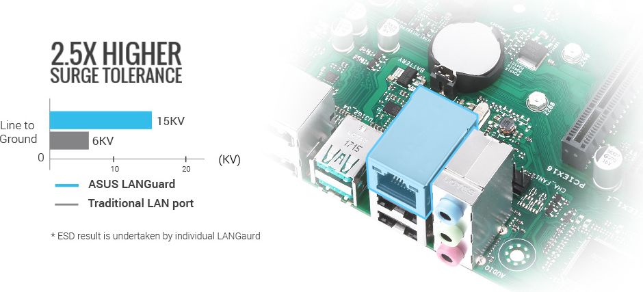 ASUS LANGuard to ochrona sieci na poziomie sprzętowym, która wykorzystuje technologię sprzęgania sygnału i najwyższej jakości kondensatory anty-EMI montowane powierzchniowo, zapewniające bardziej niezawodne połączenie i lepszą przepustowość, a także komponenty zabezpieczone elektrostatycznie i przeciwprzepięciowo, co zapewnia większą tolerancję na elektryczność statyczną i lepszą ochronę przed wzrosty.