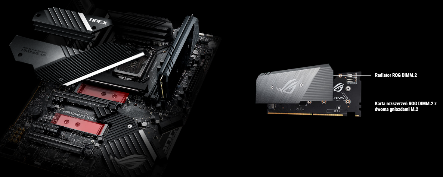 Płyta główna ROG Maximus XIII Apex jest wyposażona w cztery zintegrowane gniazda M.2, w tym dwa oferujące obsługę PCIe 4.0 do najnowszych kart graficznych i dysków SSD o wysokiej wydajności. W celu skutecznego rozpraszania ciepła wytwarzanego przez wysokowydajne dyski SSD M.2 każdy dysk korzysta z dedykowanego radiatora M.2 i zintegrowanej płyty tylnej.