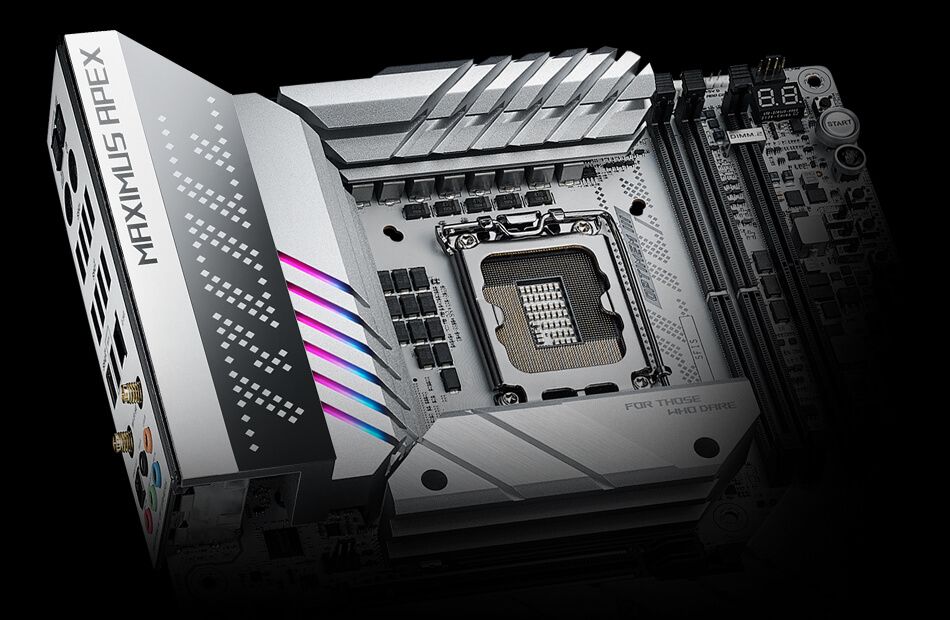 Z790 Apex zachowuje swój kultowy cross-board, ale wprowadza nową srebrno-białą kolorystykę do linii Maximus. Komponenty na pokładzie pięknie kontrastują z białą płytką drukowaną, a gustowny dotyk RGB na osłonie i radiatorze chipsetu zapewnia konfigurowalny kolor do miksu.