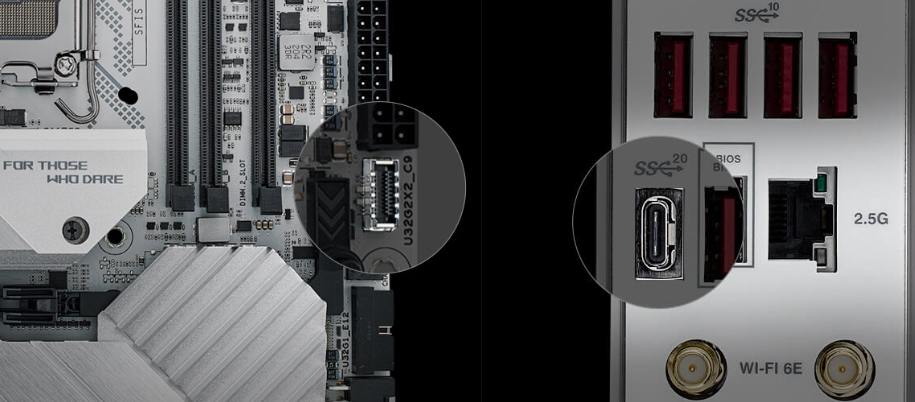 ROG Maximus Z790 Apex jest wyposażony w dwa złącza USB 3.2 Gen 2x2 Type-C®, które zapewniają szybki transfer danych do 20 Gb/s. Jeden to port na tylnym I/O; drugi można przymocować do przedniego panelu obudowy, a także obsługuje technologię Quick Charge 4+, aby szybko ładować urządzenia z mocą do 60 W.