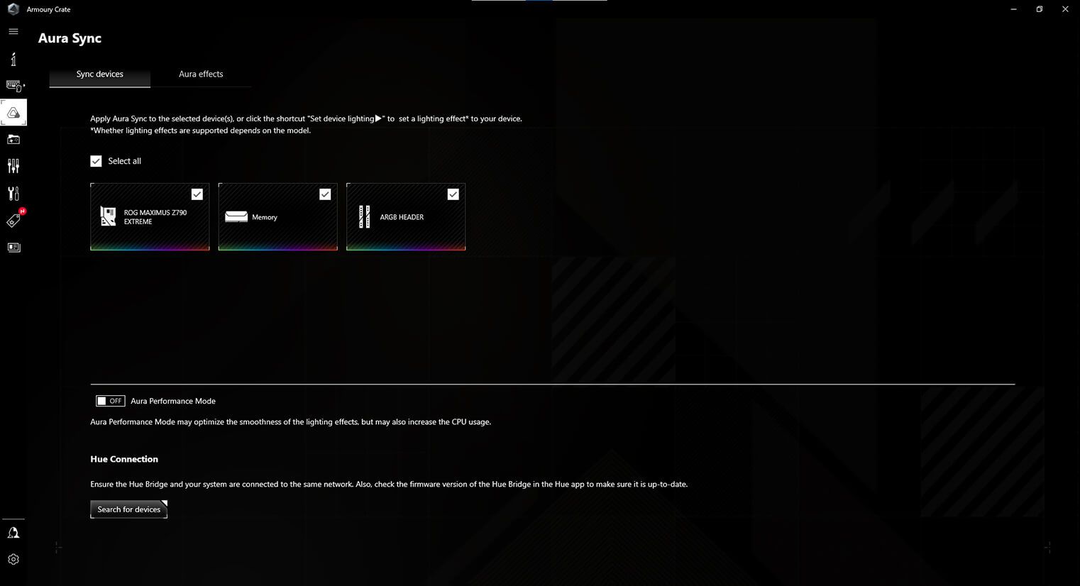 Płyty główne ROG są wyposażone w technologię ASUS Aura, która umożliwia pełną kontrolę nad oświetleniem i różnorodność ustawień wstępnych zarówno dla wbudowanych diod LED RGB, jak i akcesoriów innych firm. Efekty można łatwo synchronizować między kompatybilnymi kartami graficznymi ROG, monitorami, klawiaturami i myszami, aby nadać konfiguracji jednolity wygląd.