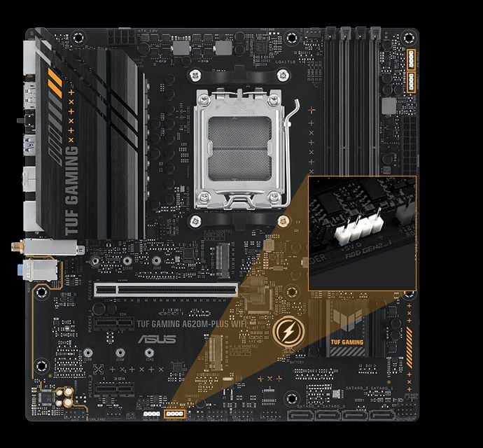 Płyty główne TUF GAMING A620 osiągają nowe wyżyny potencjału wydajności dzięki PCI Express, dwóm portom DisplayPort oraz arsenałowi portów USB, w tym złączom USB Type-A z szybkim złączem USB 3.2 Gen 1 i jednemu przedniemu złączu USB 3.2 Gen 1 Type-C® dla kompatybilnych obudów.