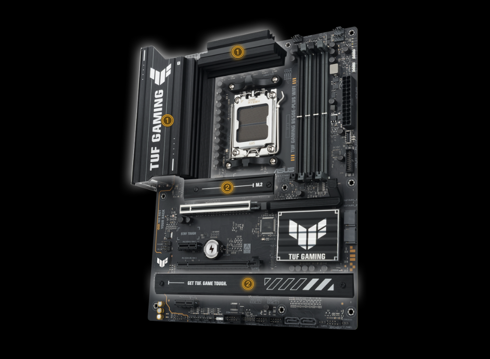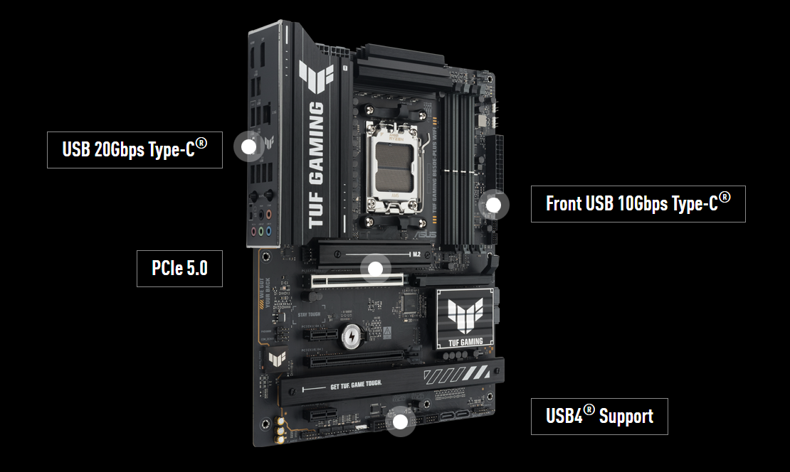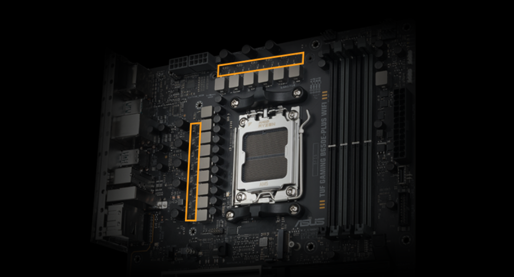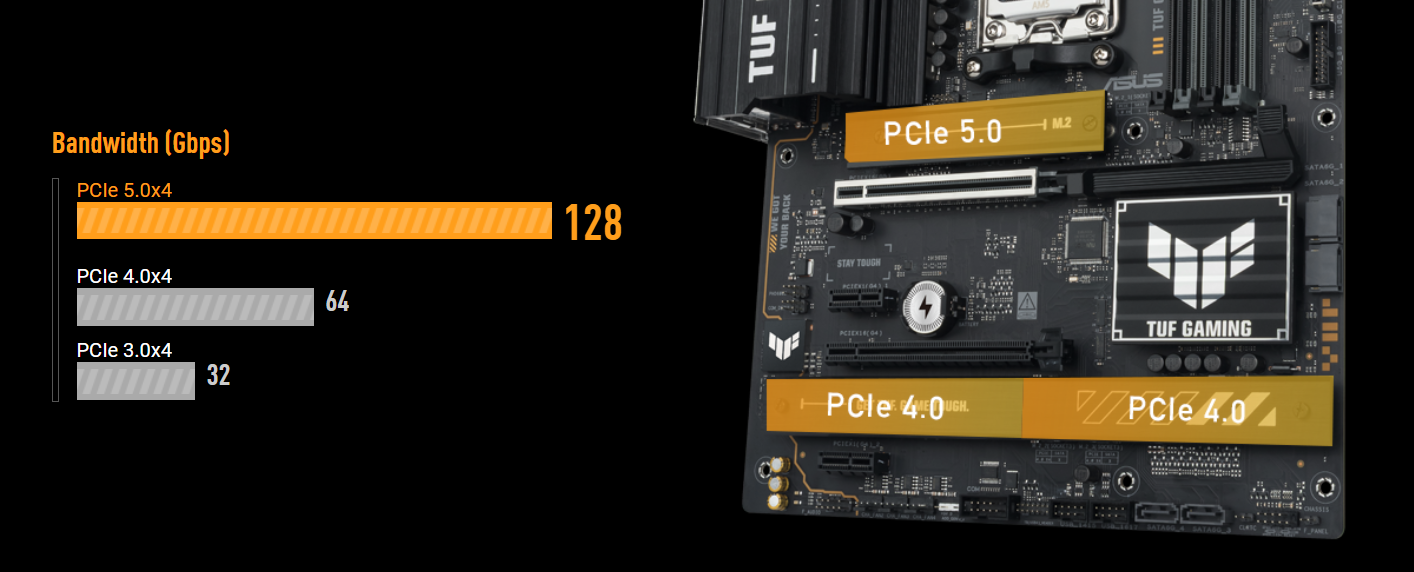 TUF GAMING B650E-PLUS WIFI jest wyposażona w slot PCIe 5.0 x16 dla karty graficznej oraz jedno gniazdo M.2 z interfejsem PCIe 5.0 dla ultraszybkich dysków SSD. Standard PCIe 5.0 oferuje dwukrotnie większą przepustowość niż PCIe 4.0, co przekłada się na maksymalną wydajność najnowszych kart graficznych i pamięci masowej. Dzięki temu rozwiązaniu Twój system jest gotowy na przyjęcie najbardziej zaawansowanych podzespołów obecnej i przyszłych generacji. Pozostałe dwa gniazda M.2 pracują w standardzie PCIe 4.0, co zapewnia elastyczność konfiguracji.