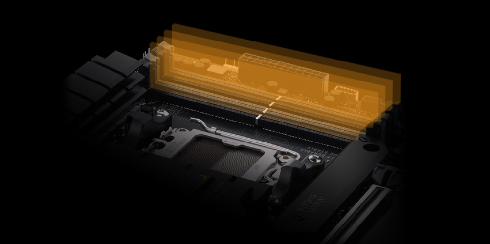 Konstrukcja sekcji zasilania w układzie 12(80A) + 2(80A) + 1(80A) (DrMOS) została zaprojektowana, aby dostarczać stabilne i czyste zasilanie do procesora, nawet podczas ekstremalnego podkręcania. Duże radiatory VRM efektywnie odprowadzają ciepło, utrzymując niskie temperatury kluczowych komponentów. Zastosowanie wysokiej jakości komponentów, takich jak dławiki i kondensatory TUF, zapewnia długotrwałą niezawodność i wydajność pod dużym obciążeniem. Dzięki temu masz pewność, że Twój procesor będzie pracował z maksymalną wydajnością.