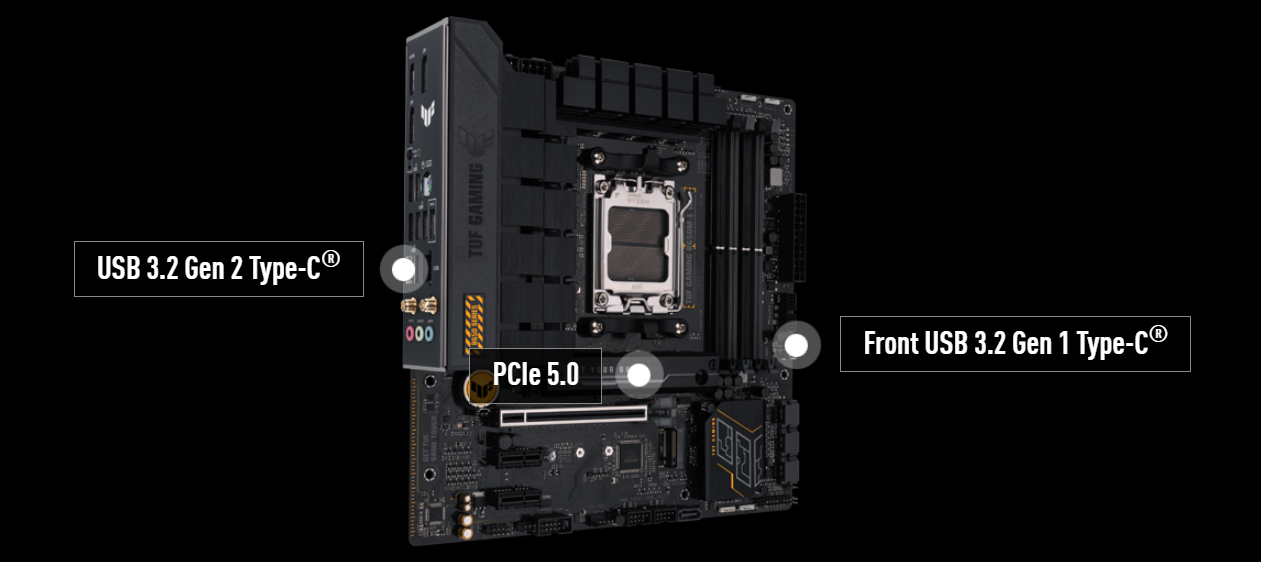 Płyty główne TUF GAMING B650 osiągają nowy poziom potencjału wydajności dzięki najnowszej wersji PCI Express, a arsenał portów USB, w tym dwa złącza Type-C®, jeszcze bardziej zwiększa kompatybilność i przepustowość.