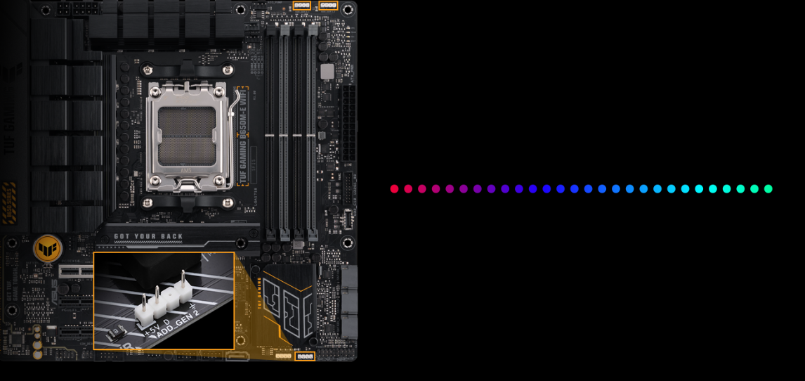 Trzy adresowalne złącza RGB Gen 2 obsługują do 500 diod LED w urządzeniach RGB Gen 2, umożliwiając Aura Sync automatyczne dostosowywanie efektów świetlnych w całym systemie. Nowe złącza oferują również pełną kompatybilność wsteczną z istniejącym sprzętem Aura Sync.