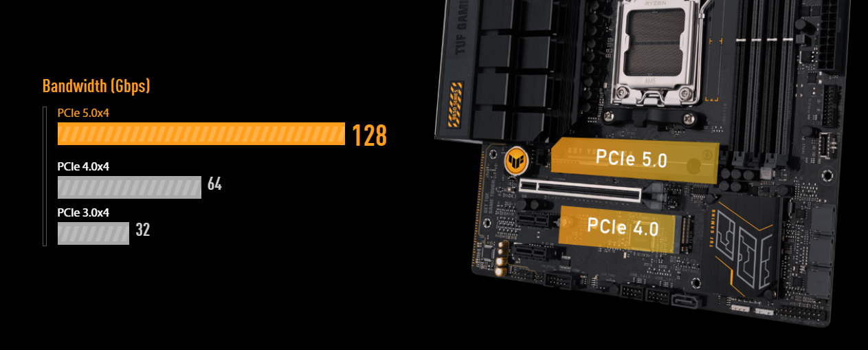 Płyty główne TUF GAMING B650 są również wyposażone w jedno gniazdo PCIe 5.0 M.2, aby cieszyć się najszybszym transferem danych do 128 Gb/s, a wszystkie gniazda M.2 obsługują konfiguracje NVMe RAID, aby wykorzystać najnowsze dostępne prędkości.